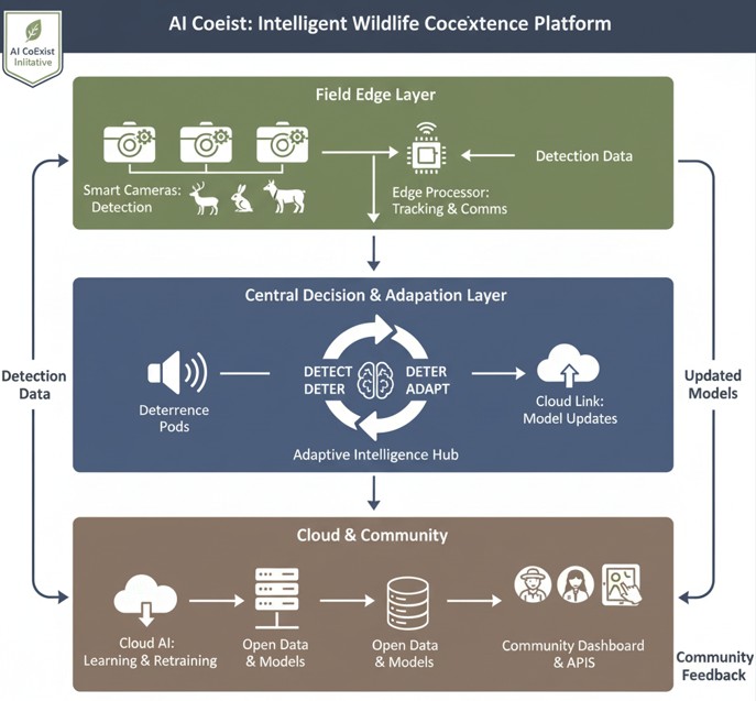 The project supports an open-source ecosystem for data, models, and APIs—empowering researchers, farmers, and communities to collaborate toward sustainable human–wildlife coexistence.